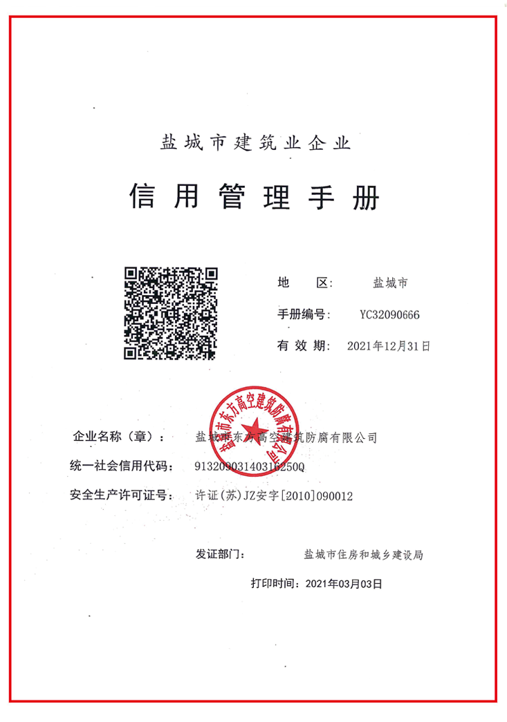 多年來,公司榮獲了江蘇省建筑業協會“最佳企業”江蘇省建設委員會頒發(fā)的“文明建設先進單位 ”同年經中國建設公司江蘇省分行企業資信等級評定委員會評為“省特級”企業;被鹽城市人民政府評為“重合同、守信用”企業;被國家化學工業部評為化工防腐一級企業,頒發(fā)了“中國防腐蝕施工一級資質證書”。